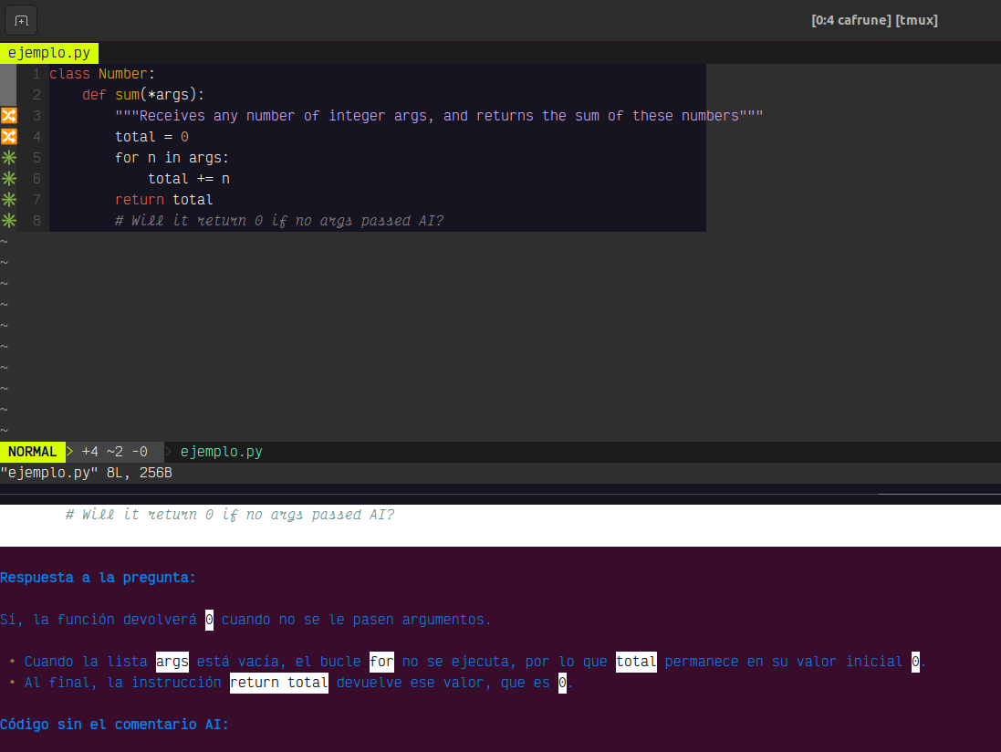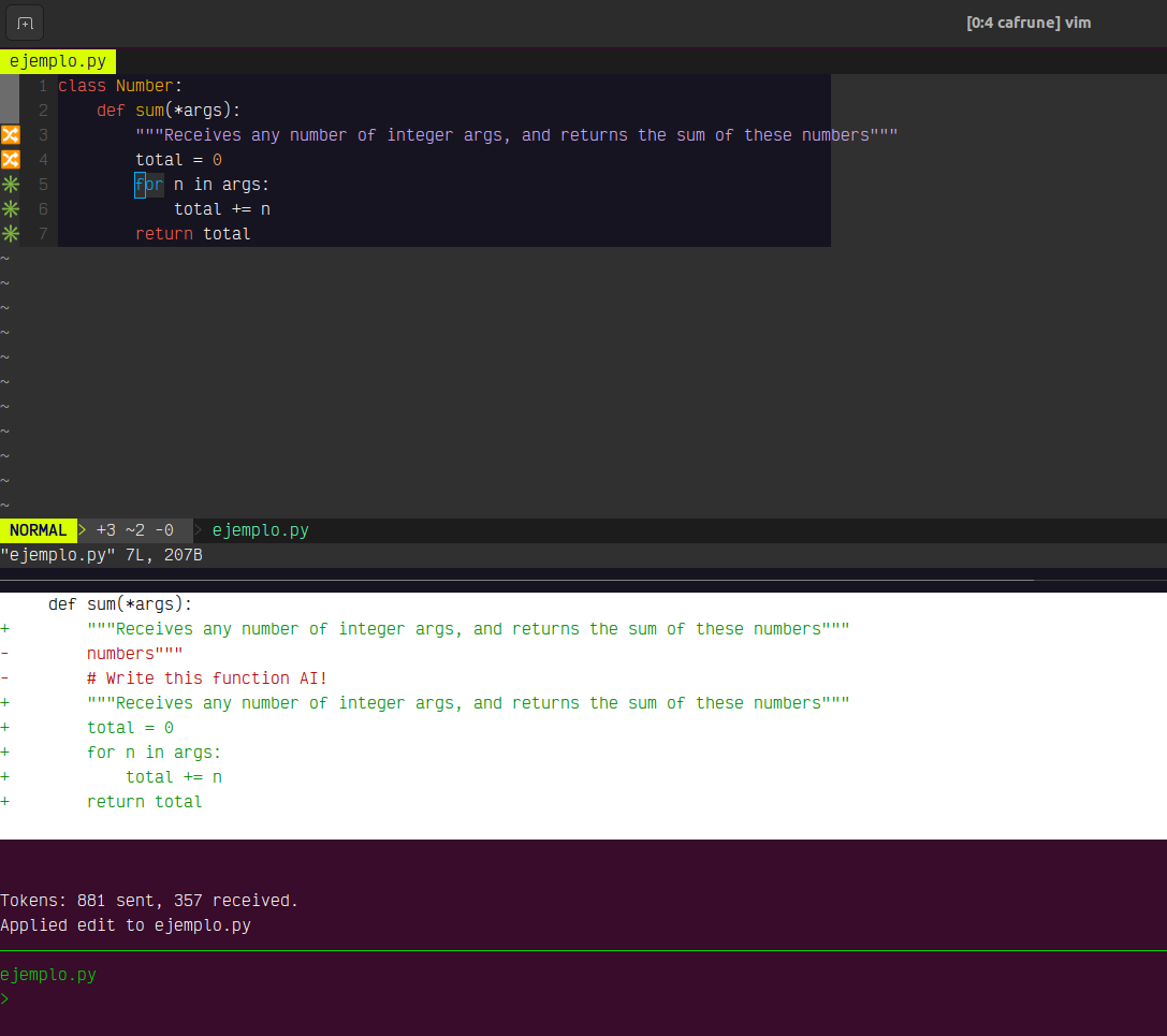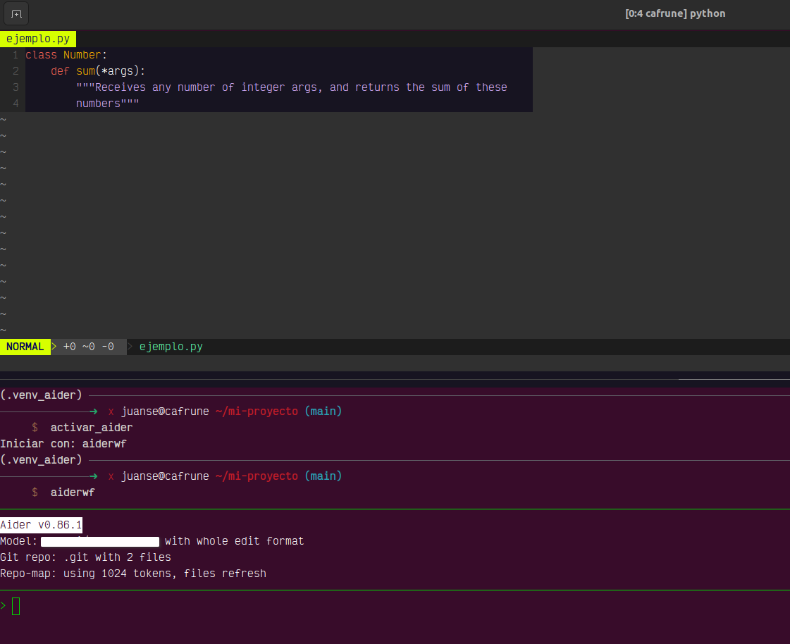 - Being in the folder where the codebase is located, as we edit a file in vim, open another panel in tmux, and activate aider with the aliases defined above.